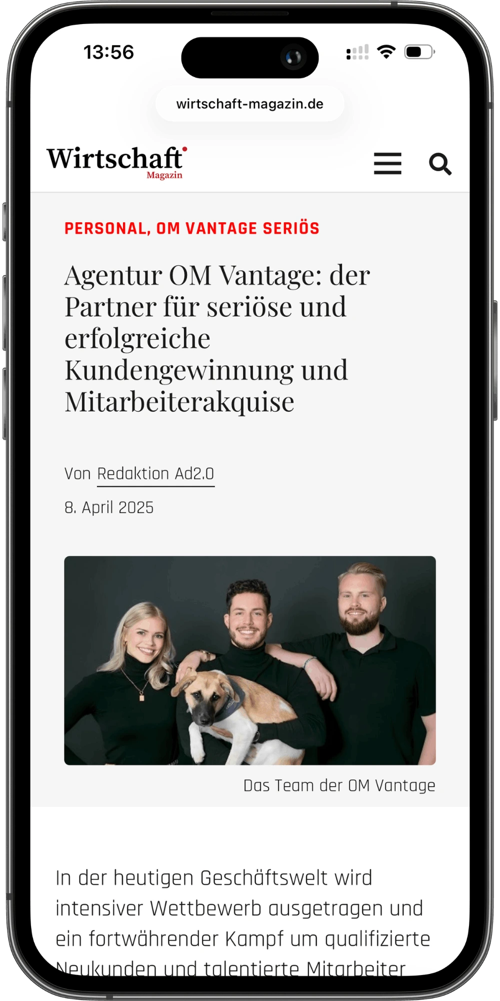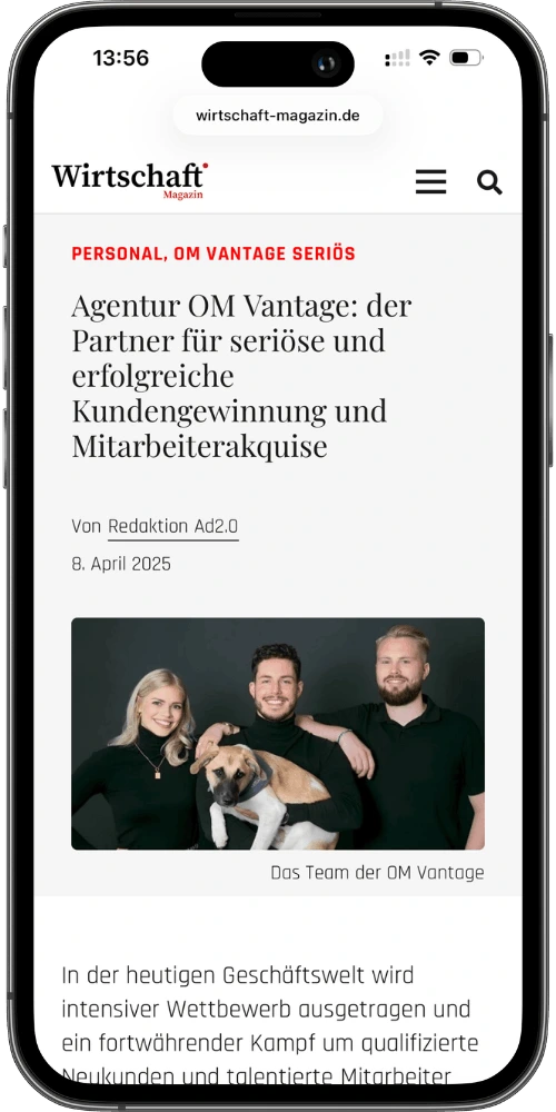 Seit dem Start unseres Lead-Projekts steht uns OM Vantage mit regelmäßigen Meetings und einer stets zuverlässigen Betreuung zur Seite. Die Menge der generierten Leads ist wirklich hoch, man muss auch über bestimmte Tage mehr Zeit reinstecken um diese zu kontaktieren. Das Gute dabei ist, dass man das natürlich das steuern kann, wie viele Leads reinkommen sollen.